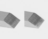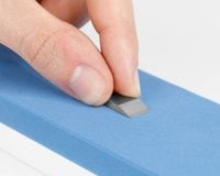 右の画像のように刃の底面に均一な反射面が現れるまで、研ぎ機を砥石の上で数回動かします。
